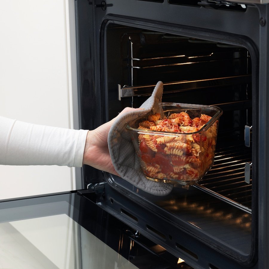 A 1.2-liter square container made with a durable glass base and a BPA-free plastic lid. Perfect for storing cooked meals or leftovers. The clear glass makes it easy to view contents, and the snap-on lid helps keep food fresh. Microwave- and dishwasher-safe (remove lid before microwaving).